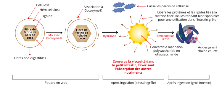Cette base est enrichie en fibres prébiotiques différenciantes : Cocofib®, fibre naturelle innovante issue de la noix de coco et documentée par des études robustes, et les fibres d’acacia, reconnues pour sa tolérance digestive exceptionnelle et son procédé de fabrication écoresponsable. Ensemble, elles constituent une matrice douce et fonctionnelle, adaptée aux microbiotes sensibles.